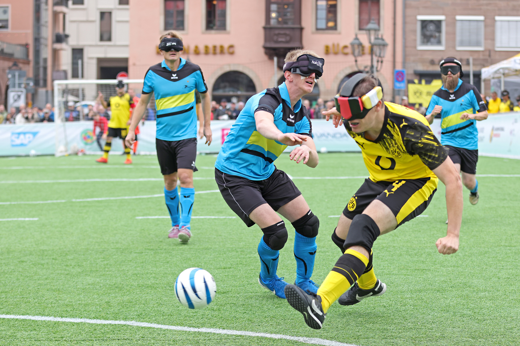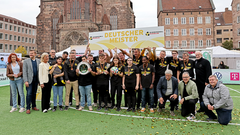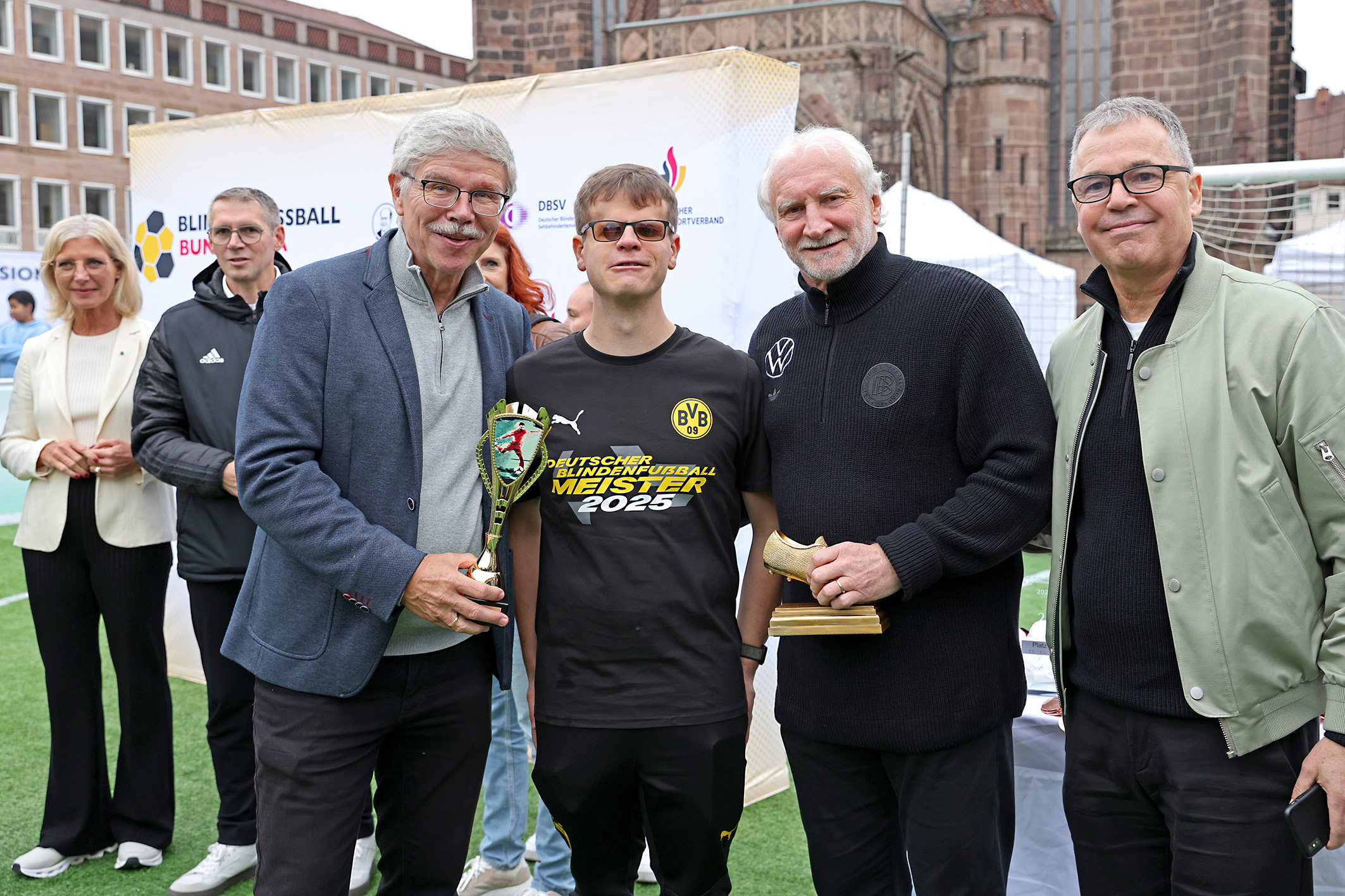Ein historischer Nachmittag für Borussia Dortmund: Der BVB feiert die erste Deutsche Meisterschaft der Vereinsgeschichte im Blindenfußball. Durch einen 2:0-Erfolg beim Finalspieltag der Blindenfußball-Bundesliga gegen die SF BG Blista Marburg krönte sich die Borussia zum Meister der Spielzeit 2025. Der Finalspieltag fand im Rahmen der Fußball-Inklusionstage der DFB-Stiftung Sepp Herberger auf dem Hauptmarkt in Nürnberg statt. Mit dabei: DFB-Sportdirektor Rudi Völler.